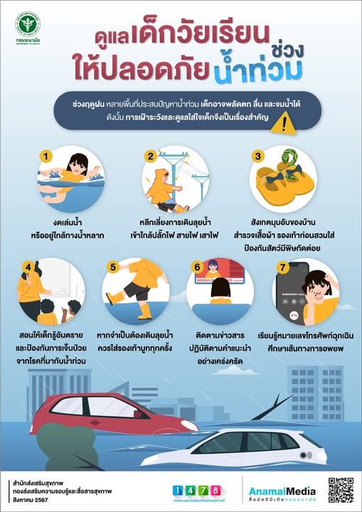 ช่วงฤดูฝน หลายพื้นที่ประสบปัญหาน้ำท่วม เด็กอาจพลัดตก ลื่น และจมน้ำได้ ดังนั้น การเฝ้้้าระวังและดุแลใส่ใจเด็กจึงเป็นเรื่องสำคัญ